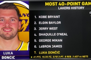 东契奇在湖人已砍17次单场40+&队史第七多 距离詹姆斯仅差一场