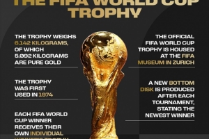 国际足联科普大力神杯:总重6.142公斤,其中5.092公斤为纯金