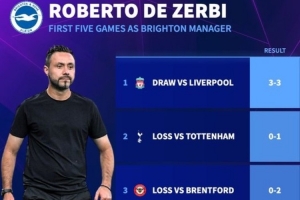德泽尔比自2022年9月起担任布莱顿主帅,上任后的前五场英超比赛,布莱顿战平了利物浦与诺丁汉森林,输给热刺、布伦特福德、曼城。