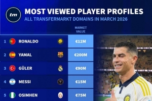 德转3月球员页面浏览量排名:C罗居首,亚马尔次席、梅西第四